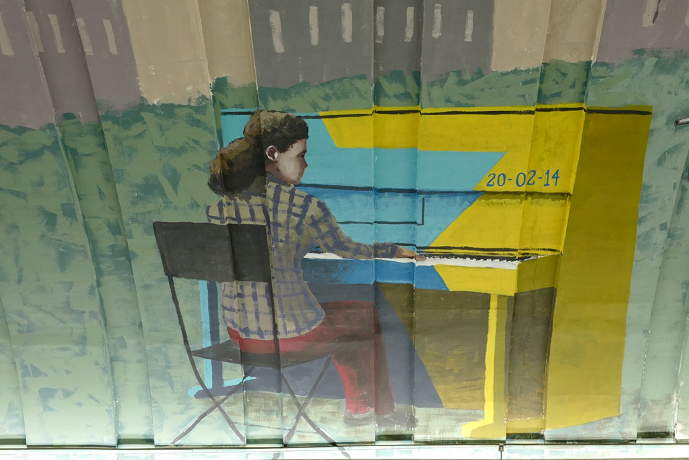 Що стосується нещодавніх конфліктів в Україні, зокрема протестів на Майдані, на муралі зображене фортепіано, яке стояло перед поліцейським кордоном 20 лютого 2014 року.