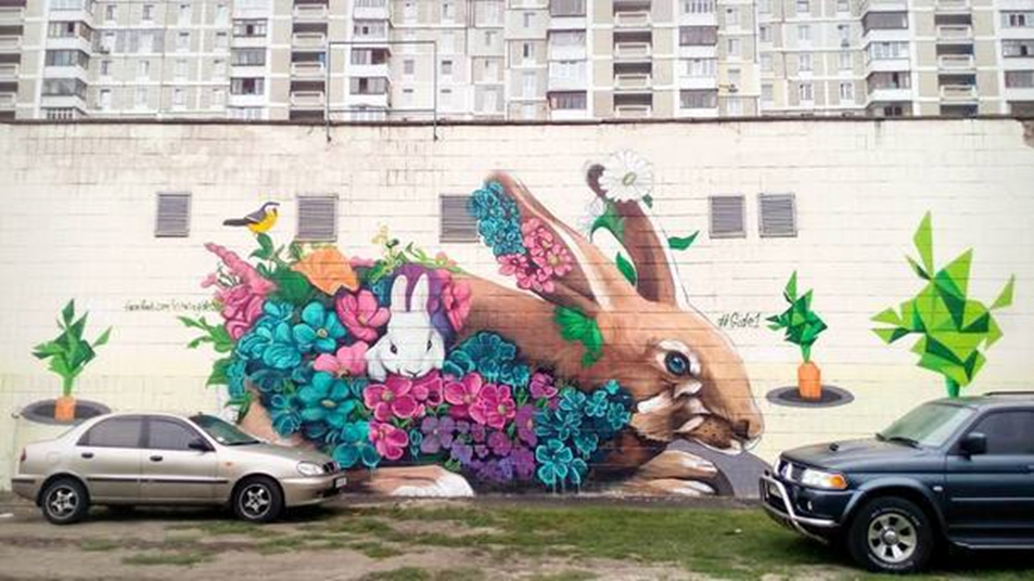 Художник зобразив звіряток на стіні бойлерної на Позняках. Барвисте графіті на стіні бойлерної (Срібнокільська, 8-Б) створив Київський художник Віталій Гідеван намалював тут двох чудових кроликів в кольорах, дві морквини і маленьку пташку.