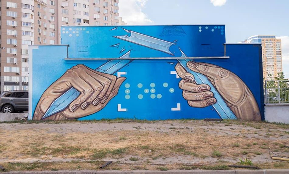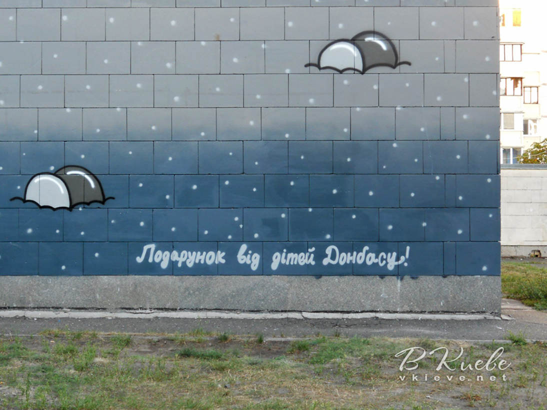 "Авдіївка". Художник взявши за основу справжнє фото Авдіївки, міста, яке зазнало руйнації внаслідок бойовий дій на сході країни, захотів нанести малюнок дитячою рукою так, ніби дитина знайшла старе фото десь в шафі або в коробці, перемалювала його, як ідеальне майбутнє, іншу реальність, ніби переосмисливши, як насправді могло б бути, кажучи тим самим, що, врешті, майбутнім поколінням доведеться прибирати наслідки скоєного дорослими.