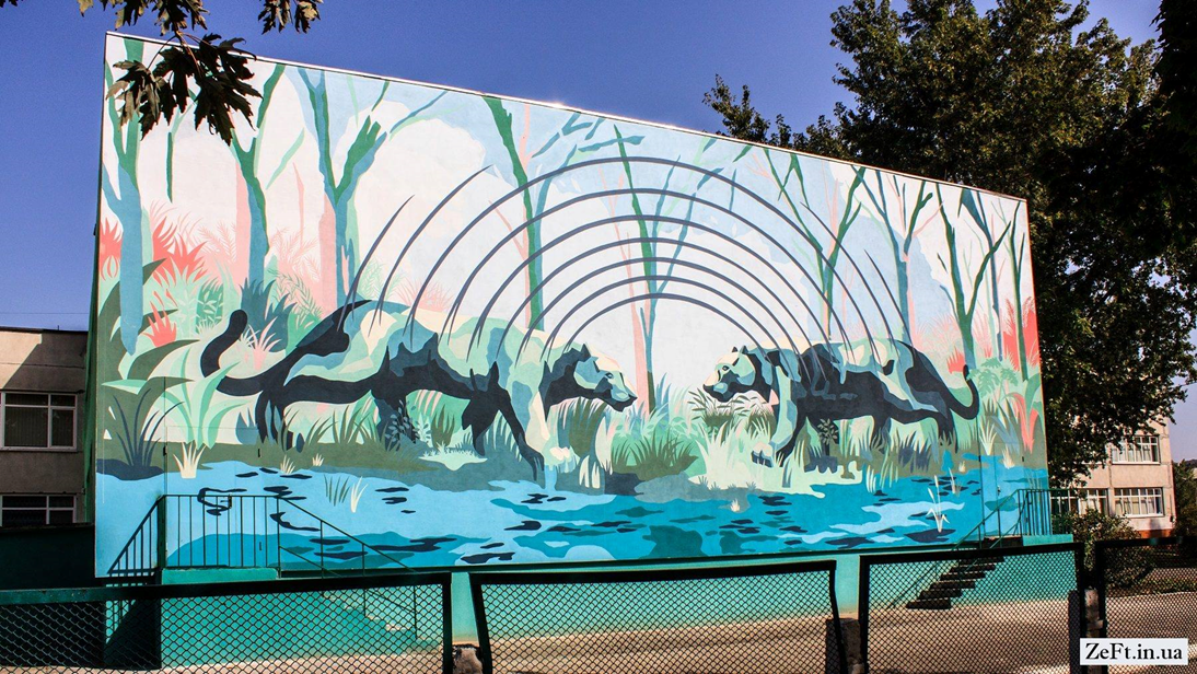 Автор муралу на гімназії аргентинський художник Franco Fasoli відомий під псевдонімом JAZ. Він намалював двох великих кішок котрі стоять посеред лісу і ведуть діалог, розмовляють на тільки їм зрозумілій мові. Смужки на їх тілі відображають комунікацію та сигнали, які вони посилають одна одній.