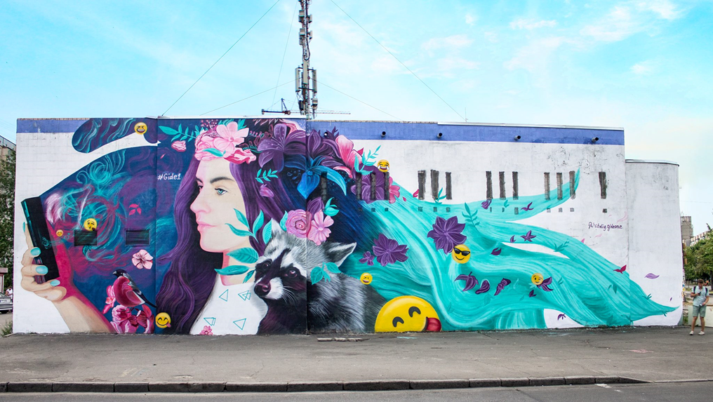 Мурал з'явився на перетині вул. Тростянецької і Архітектора Вербицького на стіні теплопункту. На малюнку зображена дівчина зі смартфоном, яка робить Селфі з єнотом. А за ними підглядає снігур і веселі смайлики.