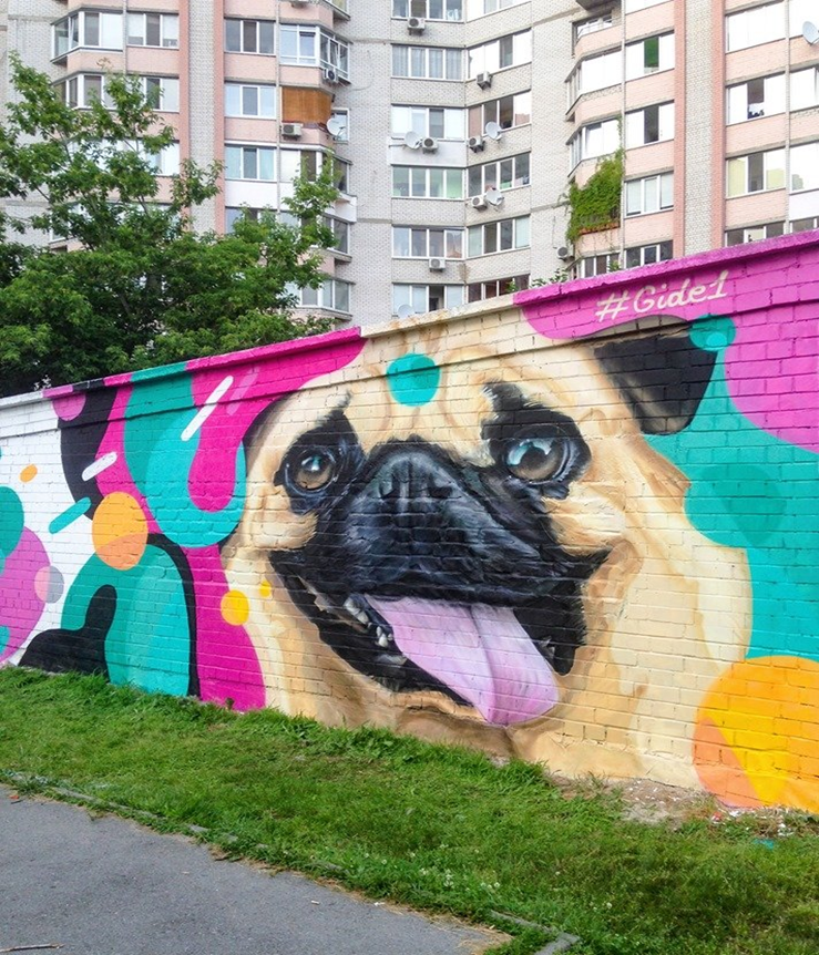 Про це автор роботи повідомив на своїй сторінці в соцмережі Facebook. На муралі зображений представник популярної породи декоративних собак – мопс.