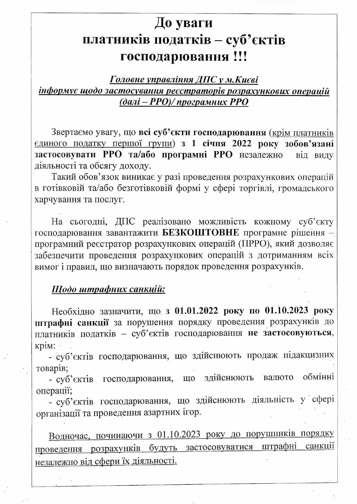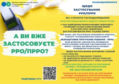 Головне управління ДПС у м. Києві повідомляє, що суб'єкти господарювання (крім платників єдиного податку першої групи) з 1 січня 2022 року зобов'язані застосовувати РРО та/або програмні РРО незалежно від виду діяльності та обсягу доходу.