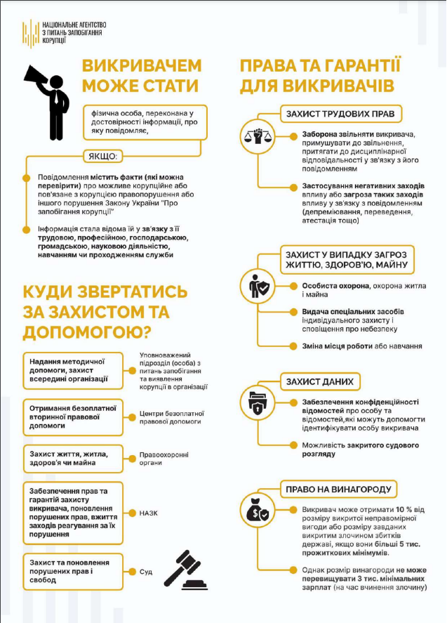 Детальніше про правовий статус викривача можна дізнатися у Роз'ясненні НАЗК: http://surl.li/prcczc.
