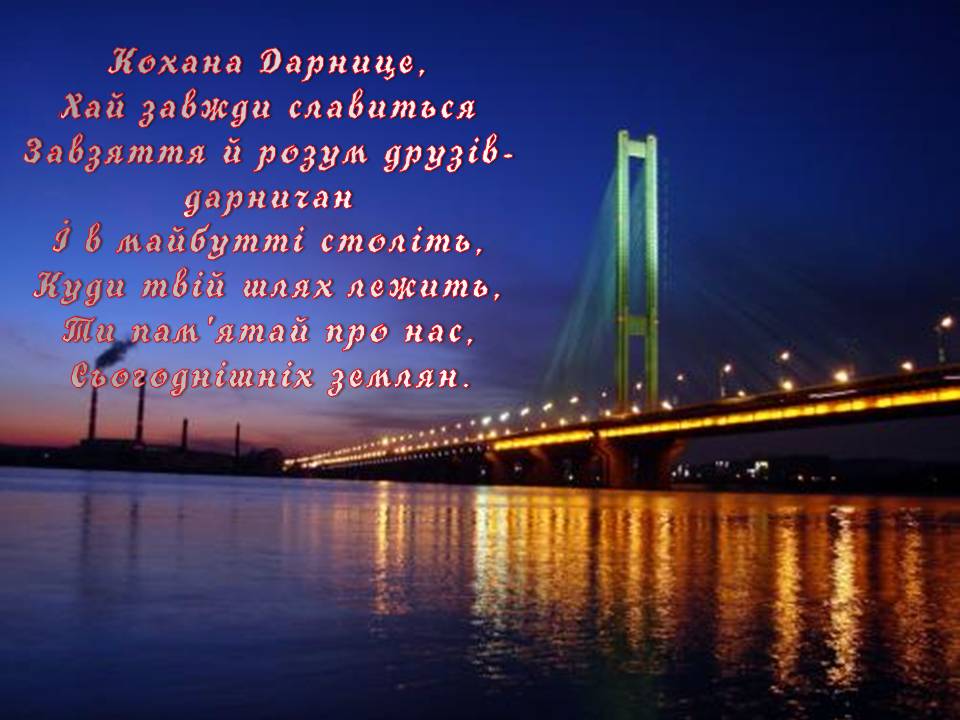 Дарниця… Слово яке чудове. Водночас дзвінке і лагідне, тепле. Як зігріта весняним сонцем земля. Земля, що принесла себе і своє багатство у дар людям, що віками дбає про них, любовно наділяючи кожного своєю життєдайною силою.