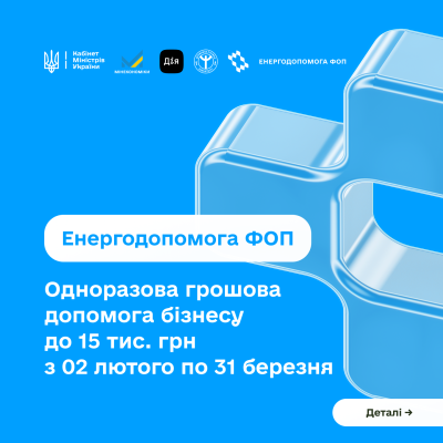 енергодопомога ФОП — безповоротну фінансову підтримку фізособам для малого бізнесу на покриття витрат, пов’язаних із роботою в умовах відключень, та