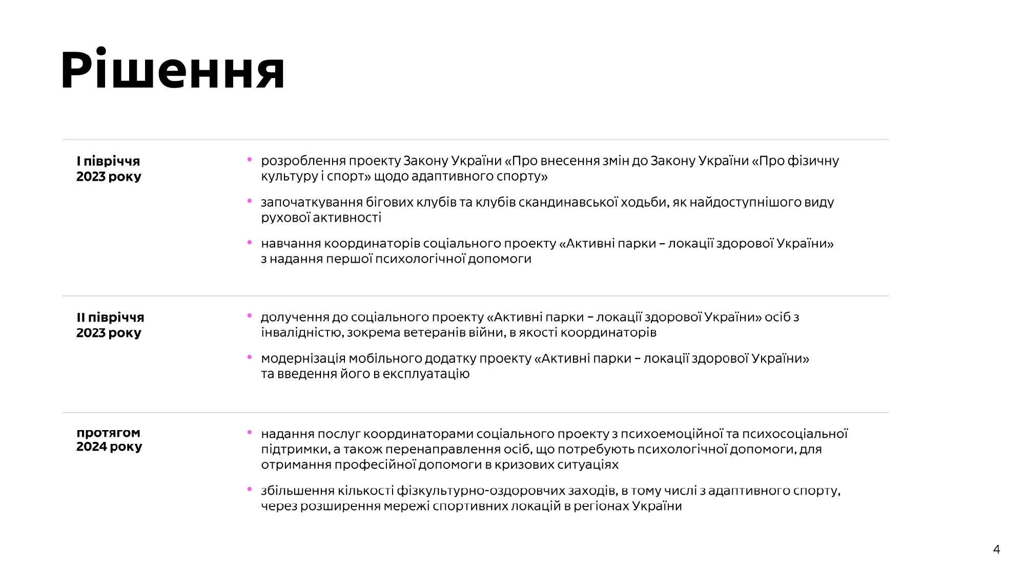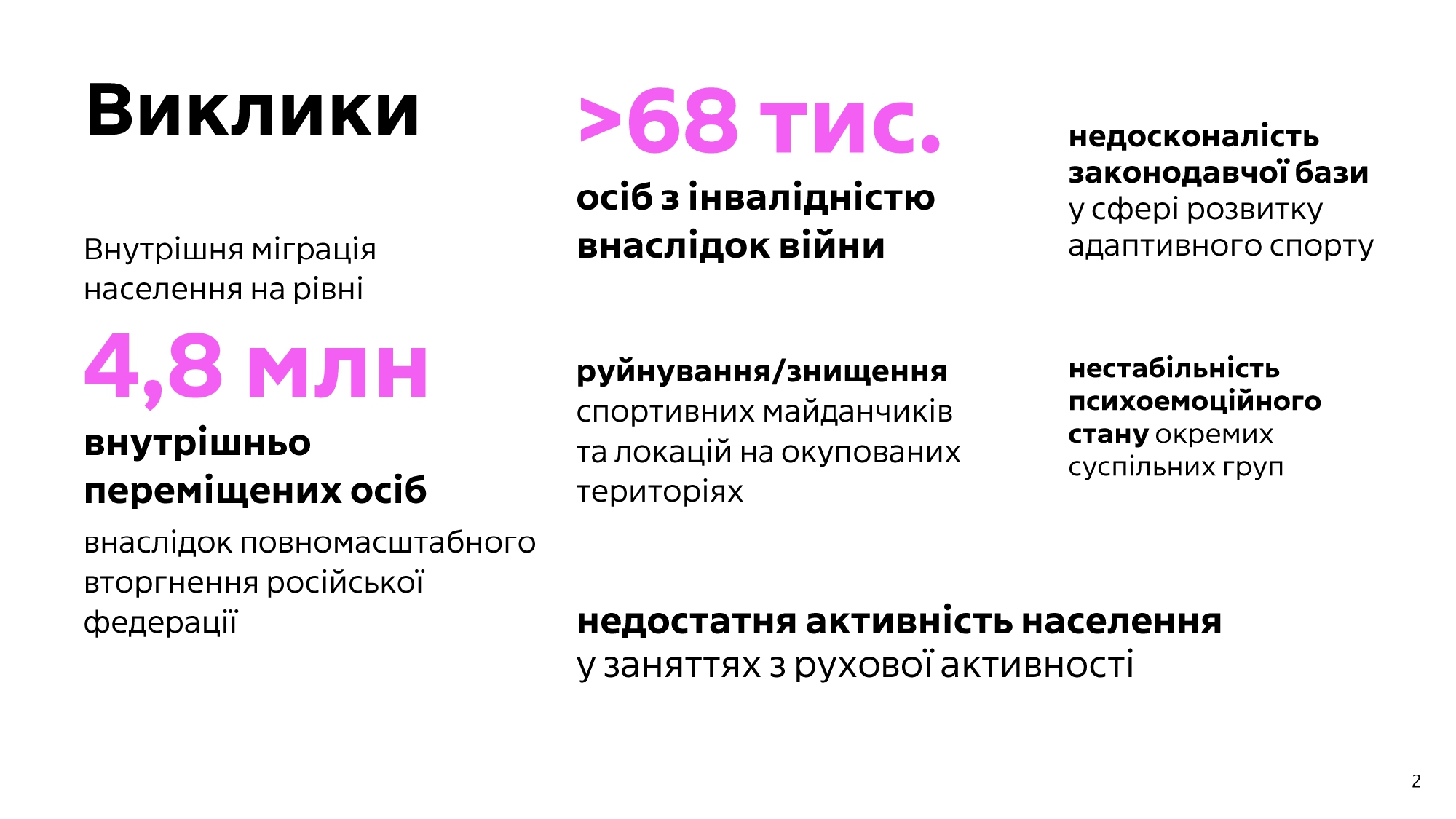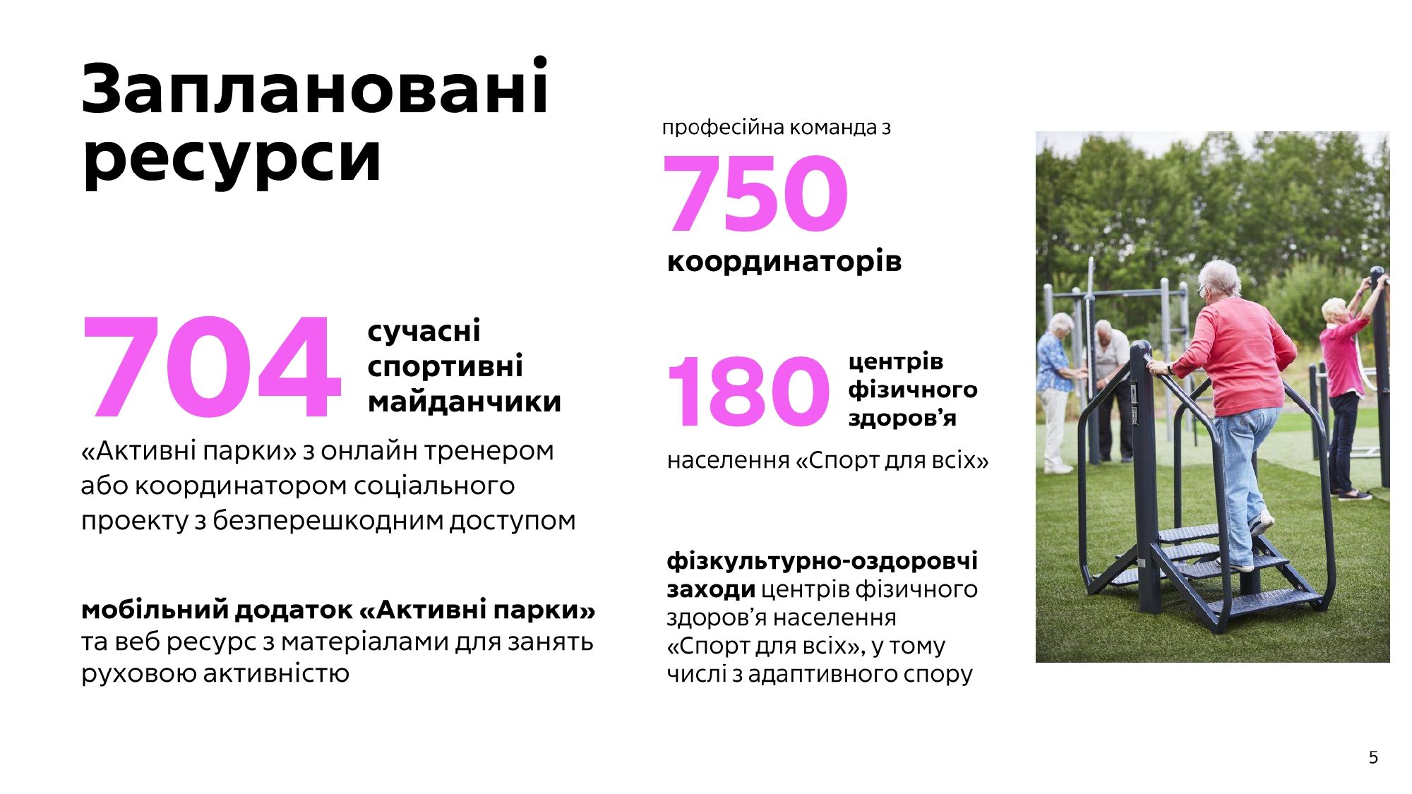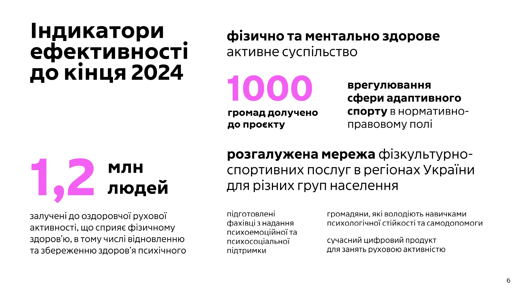 Основною метою якого є популяризація та організація оздоровчої рухової активності усіх категорій громадян, у тому числі осіб з інвалідністю та внутрішньо переміщених осіб, створення умов для зниження показників захворюваності, поліпшення якості та тривалості активного життя населення.
