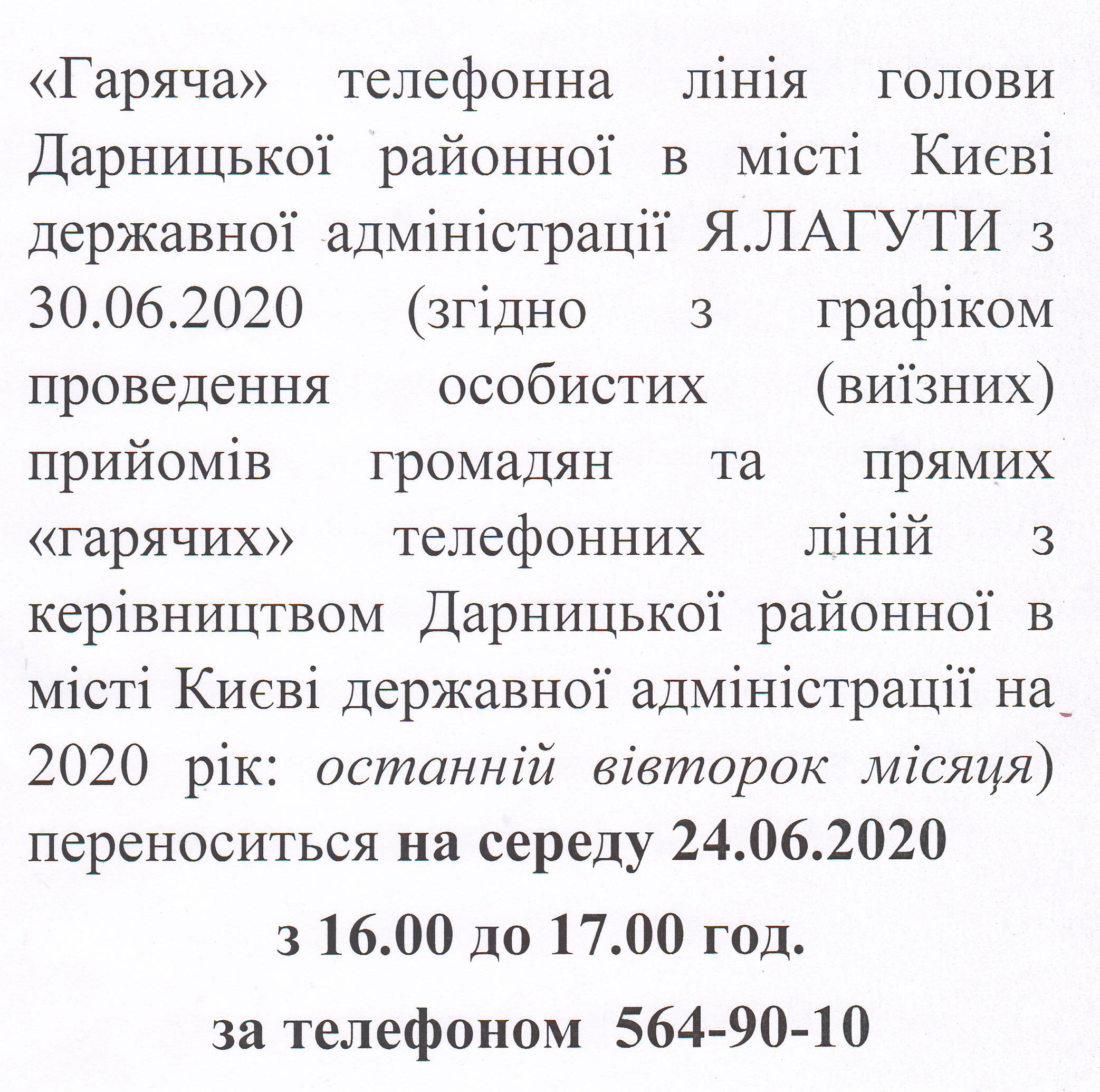 Гаряча лінія голови Дарницької райдержадміністрації відбудеться 24 червня з 16:00 до 17:00