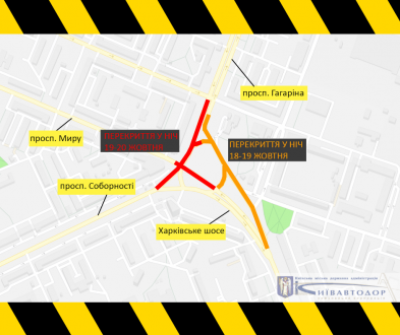Так, у ніч проти 19 жовтня буде перекрито виїзд із Харківського шосе на просп. Гагаріна і виїзд із просп. Соборності на просп. Гагаріна.