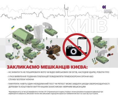 Нагадуємо мешканцям столиці та представникам медіа про категоричну заборону фото- та відеозйомки військових об'єктів, систем протиповітряної оборони, місць уражень та будь-якого переміщення чи розташування Збройних Сил України та інших військових формувань.