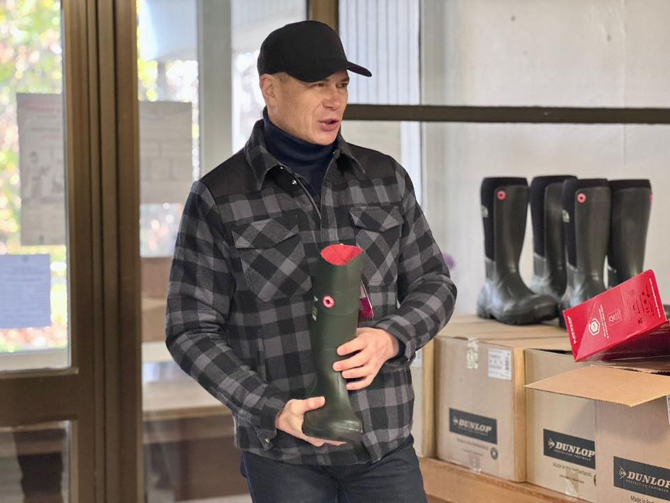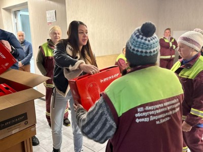Разом із головою Фонду «Україна понад усе» Евгенією Нерсесян передали працівникам КП Керуюча компанія Дарницького району 146 пар сучасних і зручних чобіт Dunlop