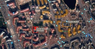 Перед вами супутникове зображення карти мікрорайону Слов'янської гімназії та ліцею №303. Кольором виділено будинки, закріплені за цими закладами освіти.
