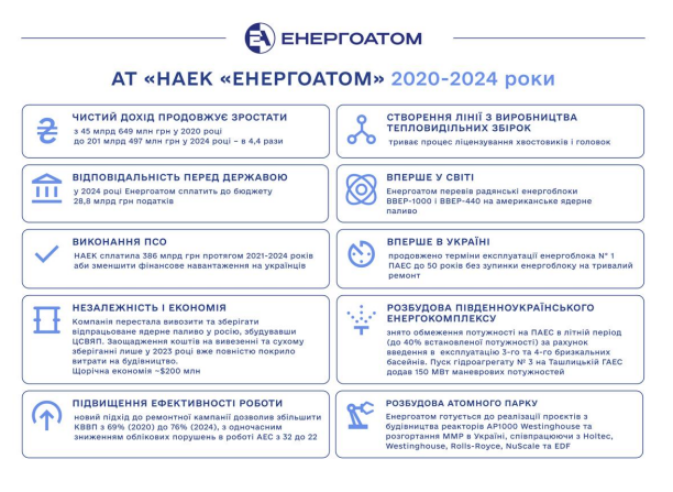 Щоб зменшити витрати українців на тарифи за електроенергію, Енергоатом за період з 2021 по 2024 рік сплатив 386 млрд грн за послугою із забезпечення доступності електричної енергії (ПСО) для побутових споживачів. Також цьогоріч компанія планує сплатити 28,8 млрд грн податків до бюджету.