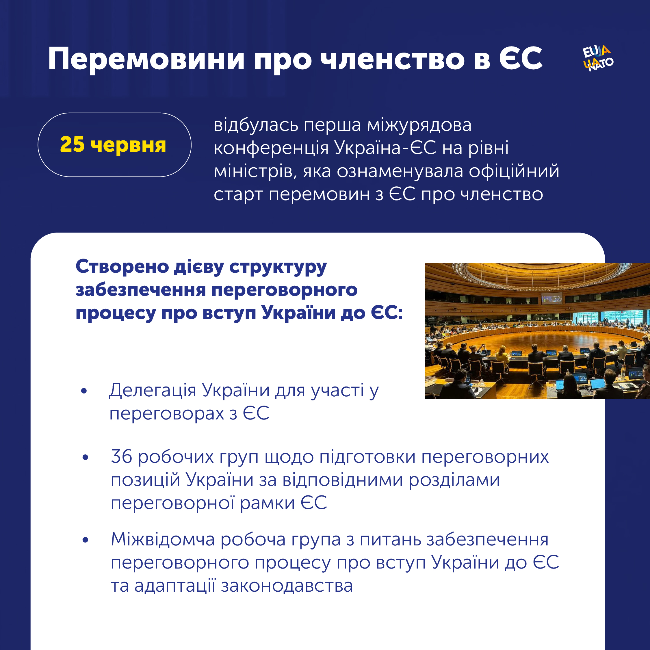 Так, 25 червня відбулась перша міжурядова конференція Україна-ЄС на рівні міністрів, яка ознаменувала офіційний старт перемовин з Європейським Союзом про членство. Україна вже створила дієву структуру забезпечення переговорного процесу щодо вступу до ЄС.