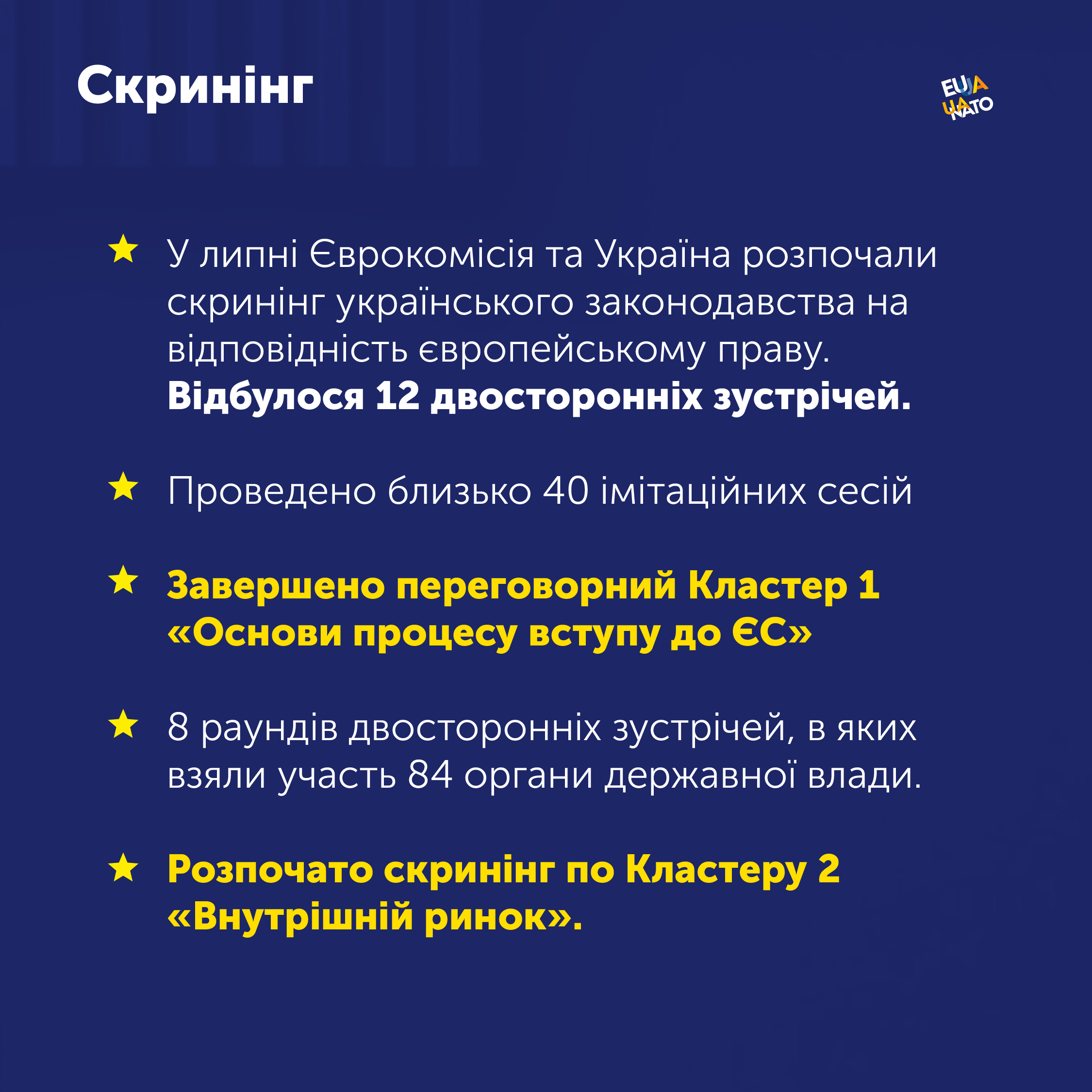 У липні Європейська Комісія та Україна розпочали скринінг українського законодавства на відповідність європейському праву, який продовжиться у 2025 році. На сьогодні, вже відбулося 12 таких двосторонніх зустрічей. Зокрема, повністю завершено переговорний Кластер 1 «Основи процесу вступу до ЄС», та розпочато скринінг за Кластером 2 «Внутрішній ринок».