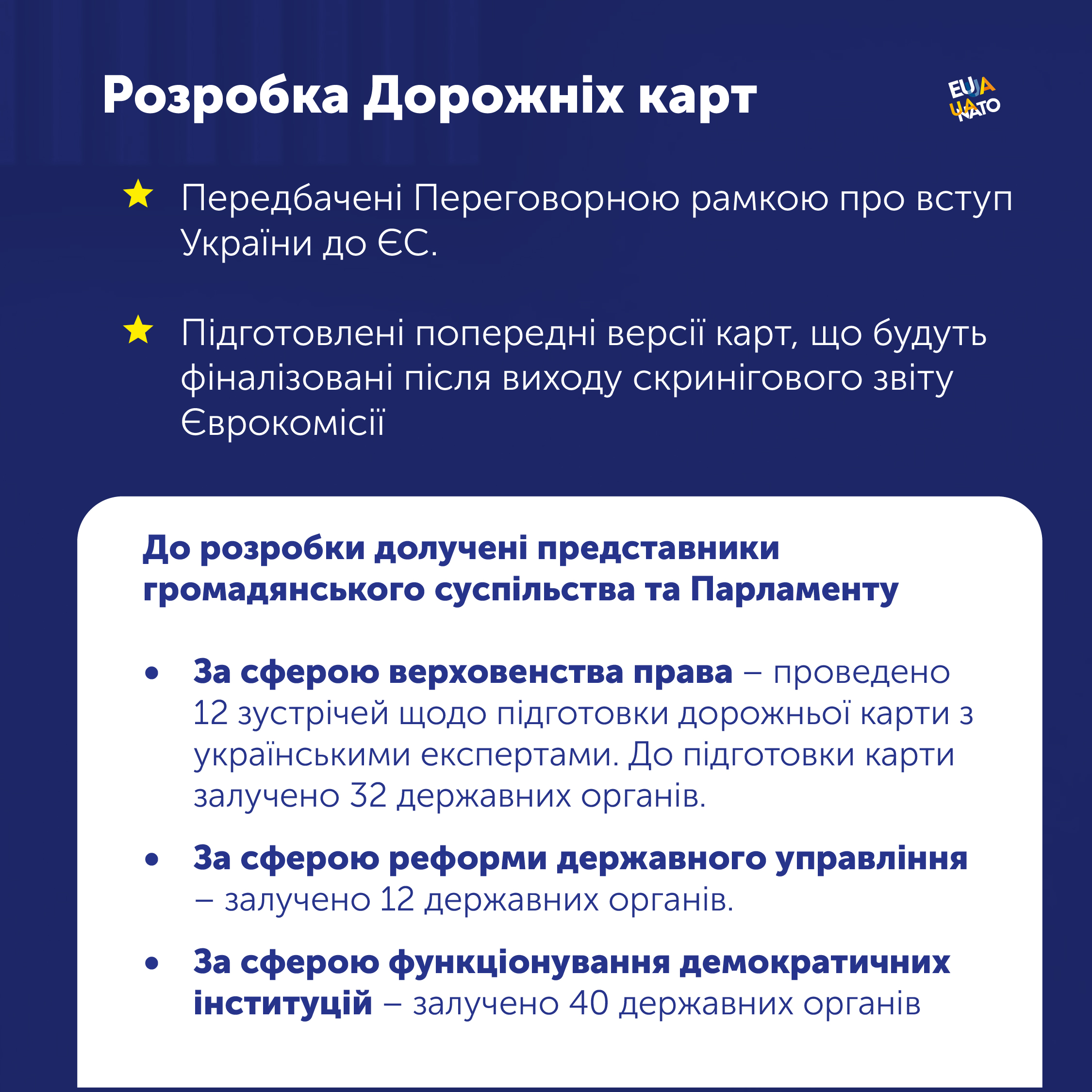 Україна розпочала розробку Дорожніх карт за сферою верховенства права, реформи державного управління та функціонування демократичних інституцій, передбачених Переговорною рамкою про вступ України до ЄС. Уже напрацьовані попередні версії карт, що будуть фіналізовані після виходу скринігового звіту Єврокомісії.