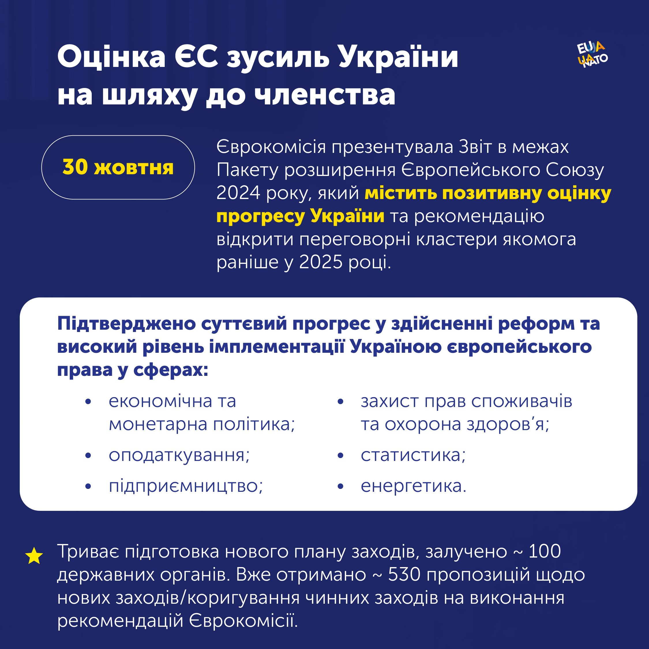 30 жовтня Єврокомісія презентувала Звіт в межах Пакету розширення Європейського Союзу 2024 року, який містить позитивну оцінку прогресу України та рекомендацію відкрити переговорні кластери якомога раніше у 2025 році.
