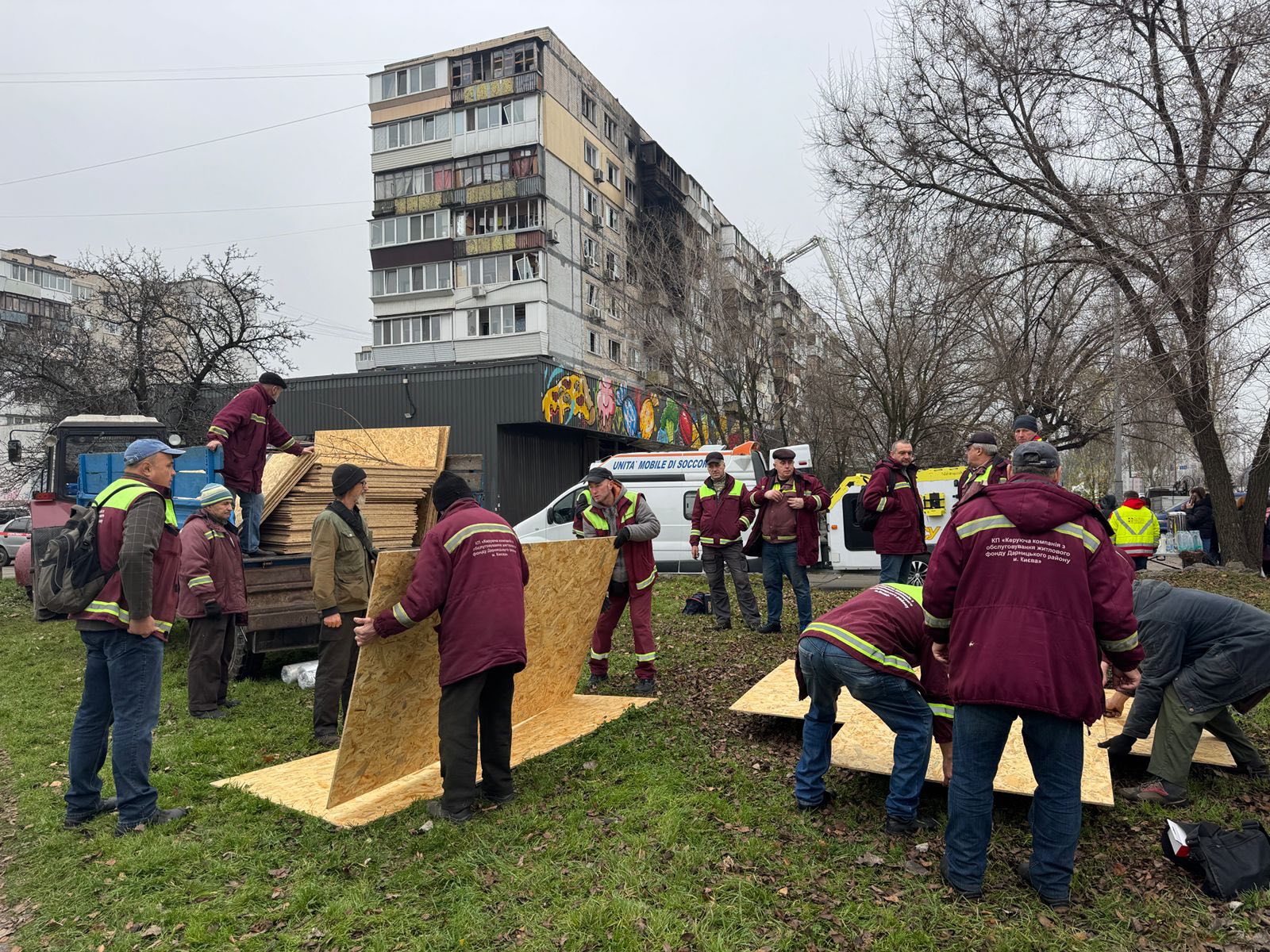Комунальні служби забезпечують жителів плівкою на OSB-плитами для тимчасового закриття пошкоджених вікон.