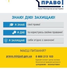 Для забезпечення оперативного реагування на звернення громадян про надання правової допомоги та на проблемні питання, які вони порушують, а також для надання роз’яснень законодавства у сфері безоплатної правової допомоги та надання правових консультацій цілодобово функціонує єдиний телефонний номер системи безоплатної правової допомоги – 0 800 213 103. Дзвінки зі стаціонарних та мобільних телефонів у межах України безкоштовні. Також отримати правову допомогу можна, особисто звернувшись до найближчого центру з надання безоплатної правової допомоги.