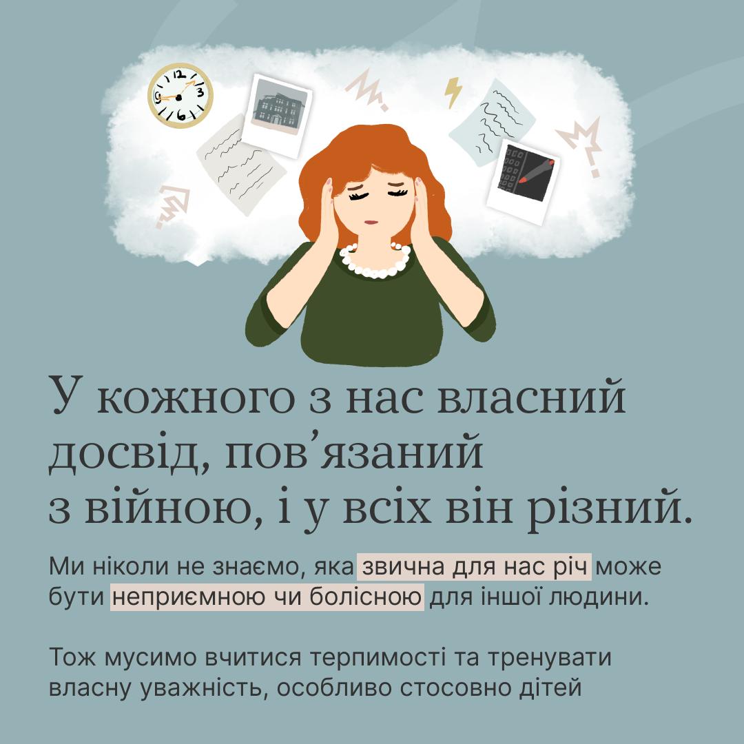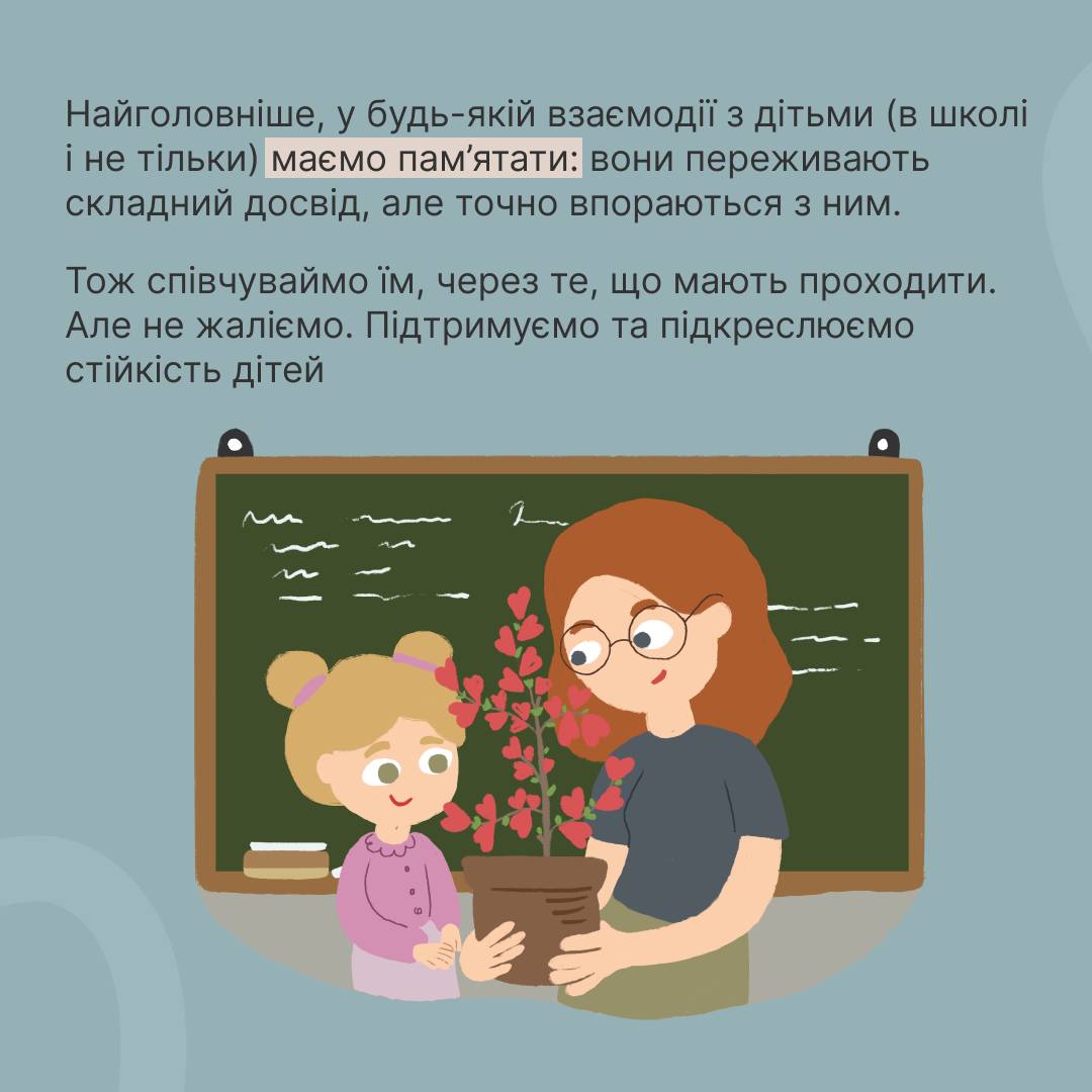 Наші діти сьогодні бачать світ інакше внаслідок травматичного досвіду, який пережили. Гучні звуки, неочікувані жести чи навіть деякі вправи із самодопомоги можуть стати для них тригером. Тож у школі вони потребують не лише знань, а й простору, де безпечно.