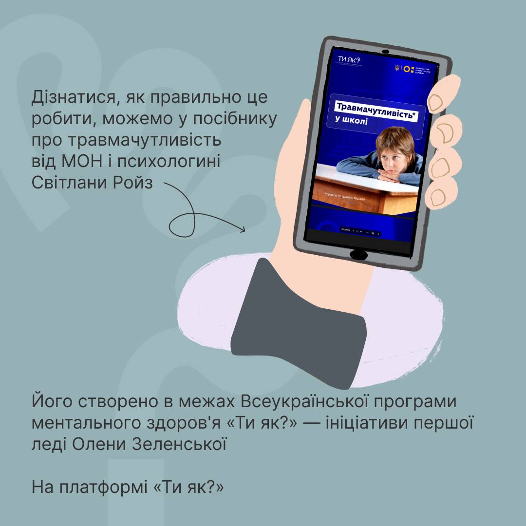 А поради щодо травмачутливості для вчителів, батьків і опікунів є у посібнику від Міністерство освіти і науки України і психологині Світлана Ройз — на платформі «Ти як?» Всеукраїнської програми ментального здоров'я за ініціативою Олена Зеленська