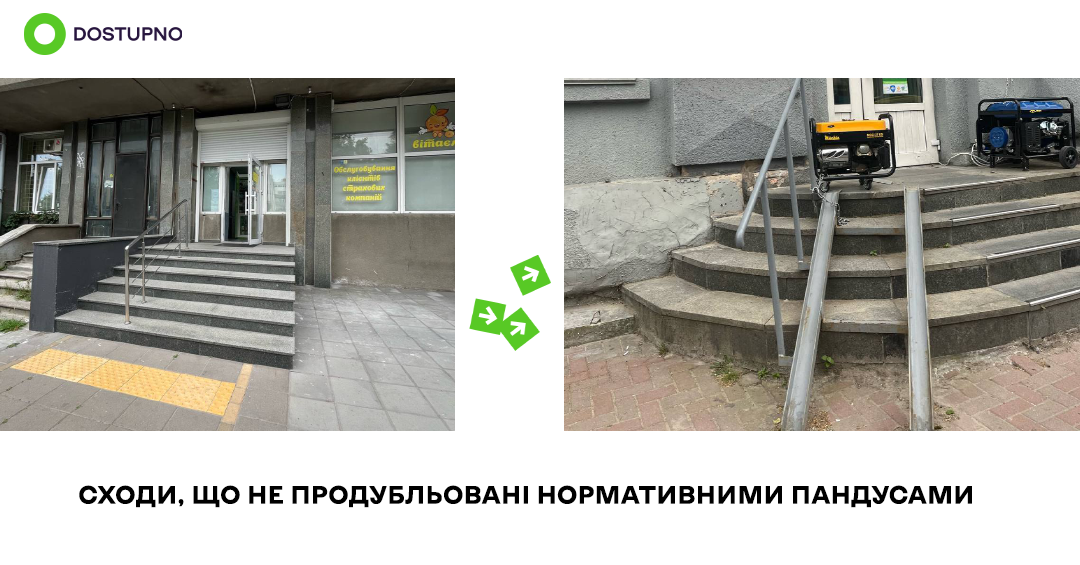 ▪ вхідну групу (сходи без пандусів, пороги, ненормативні пандуси і т. ін.);