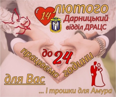 В день всіх закоханих Дарницький районний відділ ДРАЦС допомагає святому Валентину в посиленому режимі (з 8:00 до 24:00)