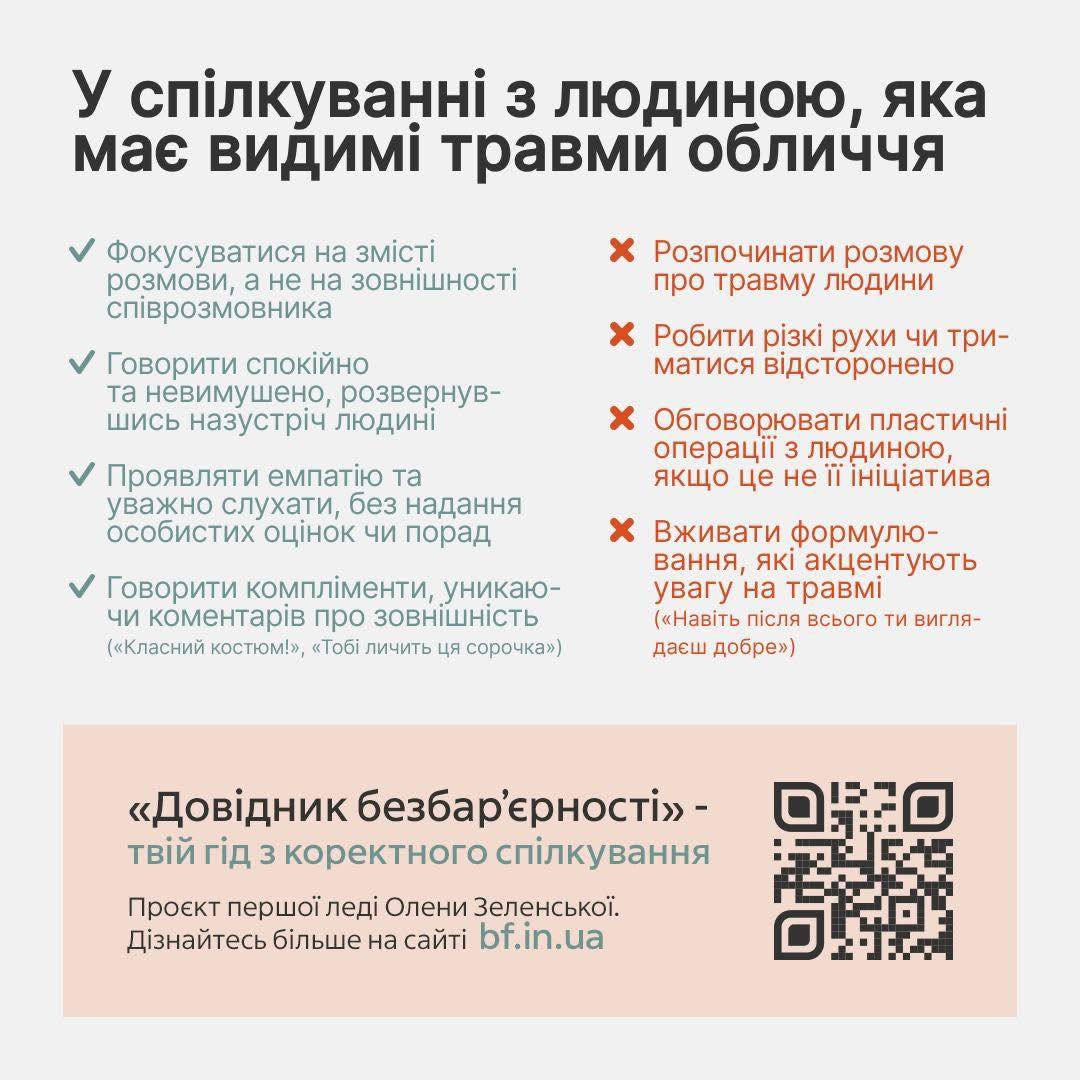 Про те, як коректно взаємодіяти з різними людьми, зокрема й зі співрозмовниками, які мають видимі травми обличчя, розповідає оновлений розділ (https://bf.in.ua/.../liudyna-iaka-maie-vydymi-travmy.../) «Довідника безбар’єрності».